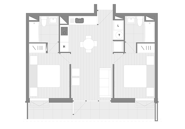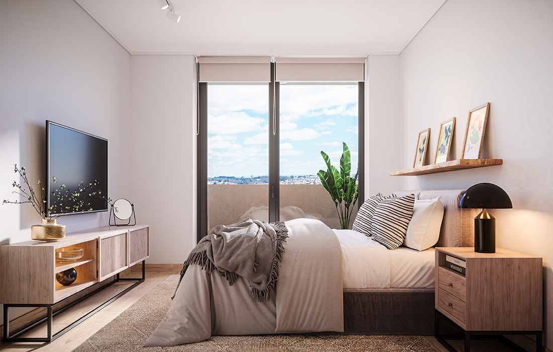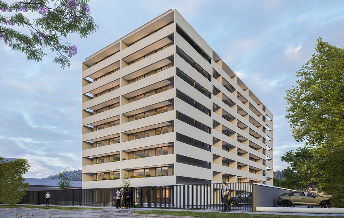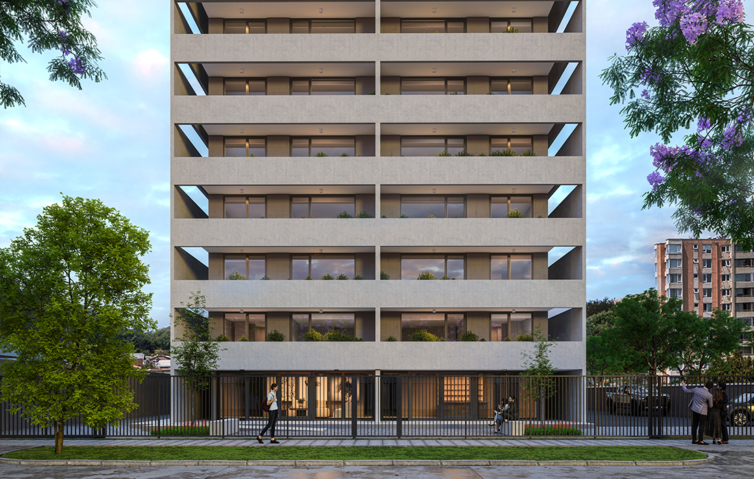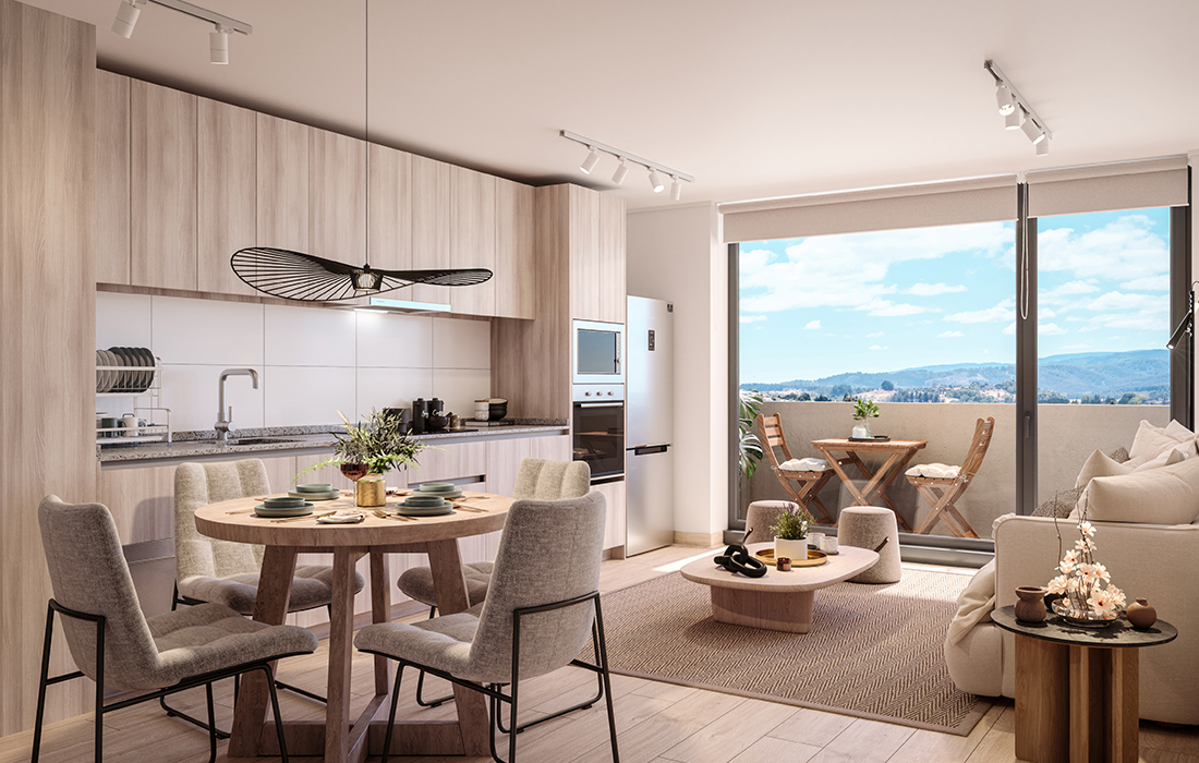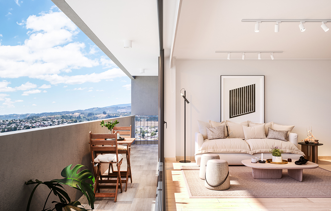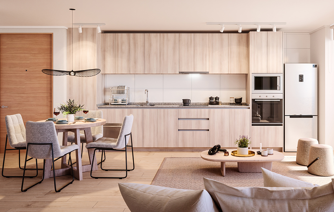 · Piso vinílico en living, dormitorios y cocinas | Porcelanato en baños y terrazas · Full Electric: cocina equipada con encimera vitrocerámica, horno eléctrico, campana, microondas, lavavajillas y termo eléctrico por departamento para ahorro en consumo · Cubierta de granito en cocina · Todos los departamentos cuentan con espacio para lavadora · Envolvente térmica: aislación térmica y ventilación de espacios, ventanas termopanel, aislación de cielos y pisos ventilados, y sistema de renovación de aire · MILLACERO es una tecnología que gestiona de manera eficiente el ahorro de gastos comunes, entregando seguridad a los residentes, con el sistema que incorpora conserje remoto junto con la gestión de encomiendas.